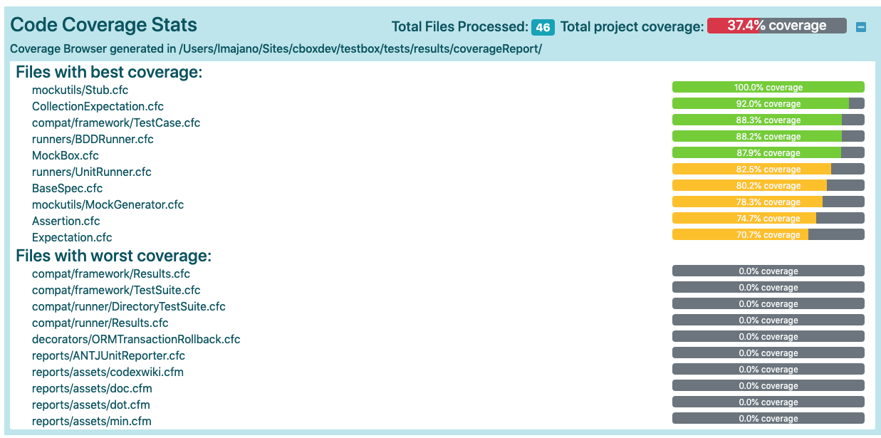 TestBox supports code coverage statistics out-of-the box with no changes to your test suite and you can capture the data in a handful of ways, including a Coverage Browser report which visualizes every CF file in your code and shows you what lines executed and what lines didn't.