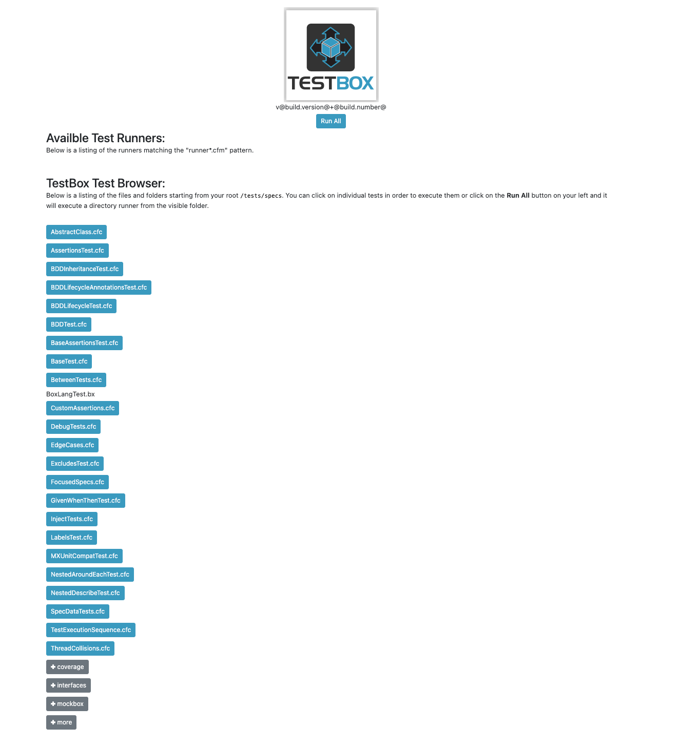 TestBox ships with a test browser that is highly configurable to whatever URL accessible path you want. It will then show you a test browser where you can navigate and execute not only individual tests, but also directory suites as well.