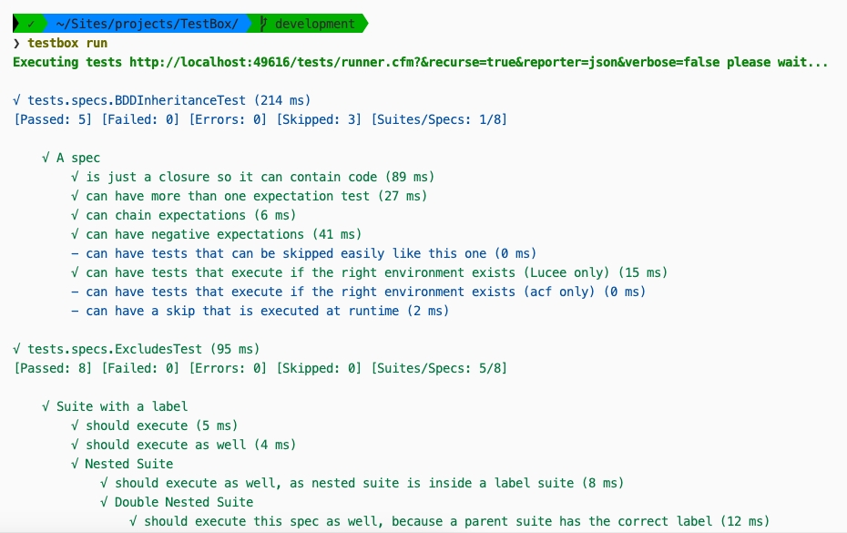 The easiest way to run your tests is to use the TestBox CLI via the testbox run