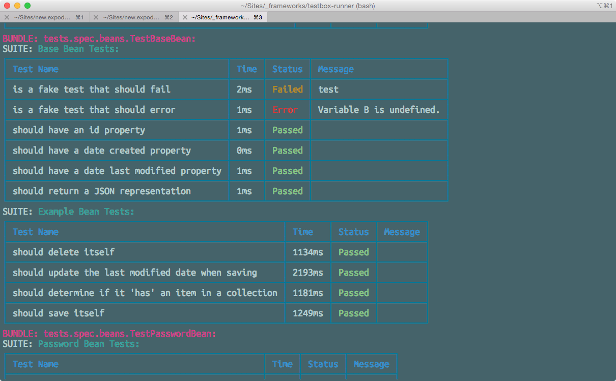 TestBox ships with several test runners internally but we have tried to simplify and abstract it with our testbox object which can be found in the testbox.system package. The TestBox object allows you to execute tests from a variety of entry points and languages such as CFC, CFM, HTTP, NodeJS, SOAP or REST. You can also make your CFC's extend from our BaseSpec class so you can execute it directly via the URL. The main execution methods are: