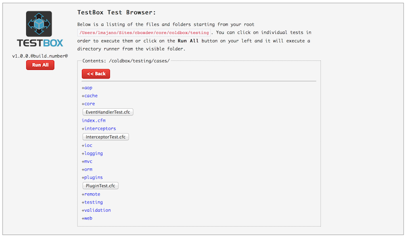 TestBox ships with a test browser that is highly configurable to whatever URL accessible path you want. It will then show you a test browser where you can navigate and execute not only individual tests, but also directory suites as well.